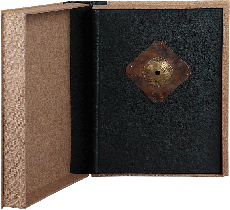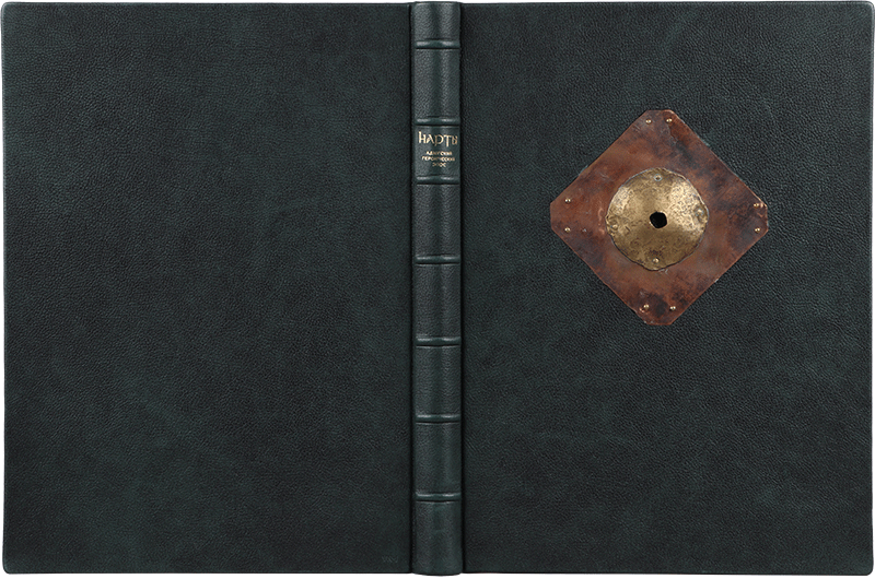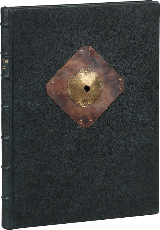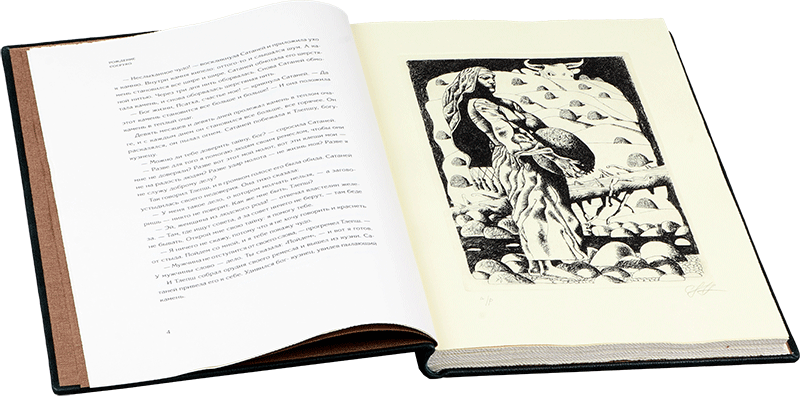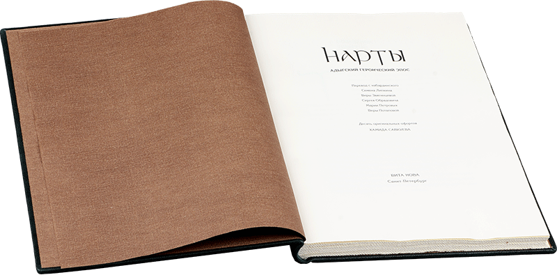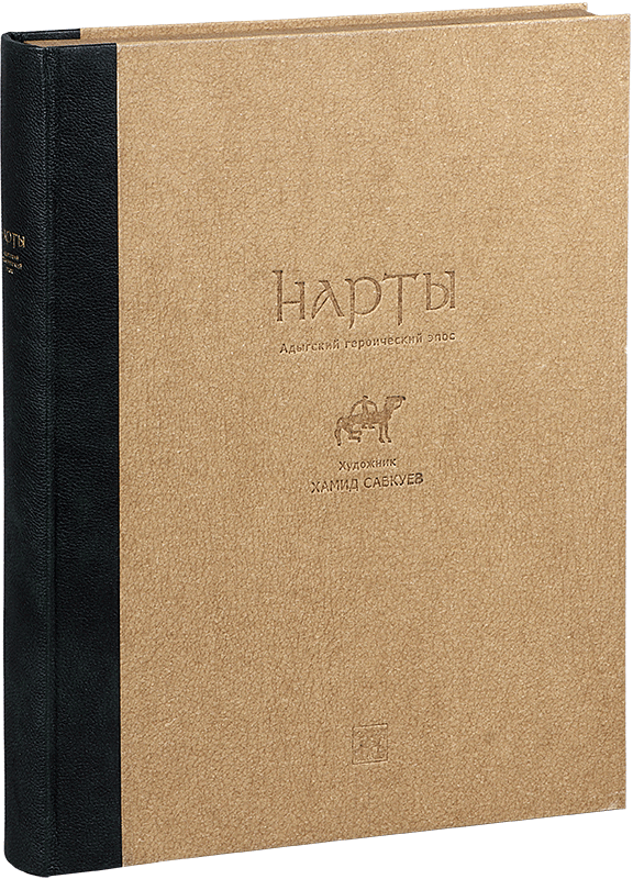 НАРТЫ. Адыгский героический эпосО КНИГЕХудожник Хамид Савкуев Автор переплета Сергей Плаксин Руководитель мастерской Елена Парфёнова Книга содержит 10 офортов Хамида Савкуева. Офорты отпечатаны в 2017 году на бумаге Somerset (Великобритания). Цельнокожаный переплет выполнен из специальной кожи высшего качества для художественных переплетов (Германия). В оформлении использованы авторские накладки (латунь, патинирование). Обрез торшонированный. Форзацы: дизайнерская бумага. Каптал ручного плетения, шелк двух цветов. Цельнокожаный переплет выполнен из специальной кожи высшего качества для художественных переплетов (Германия). Авторская накладка (латунь, патинирование).