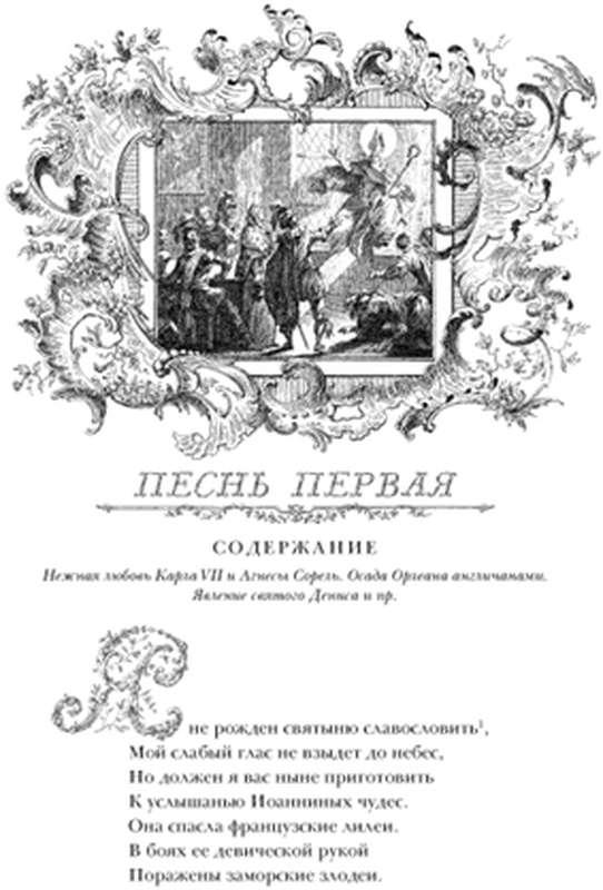 Поэма «Орлеанская девственница», принадлежащая перу Франсуа-Мари Аруэ (1694–1778), вошедшего в историю под литературным именем Вольтер, — одна из главных эпических поэм в литературе Нового времени. Воплотившая в себе отточенное остроумие, тонкую иронию и изящество стиля, присущие Вольтеру, «Орлеанская девственница» оказала значительное влияние на развитие европейской поэзии.