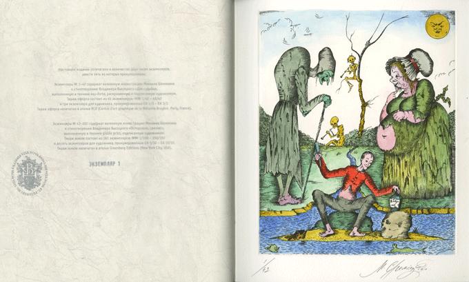 Экземпляры 1-42 содержат вклеенную иллюстрацию Михаила Шемякина к стихотворению Владимира Высоцкого «Две судьбы», выполненную в технике eau-forte, раскрашенную и подписанную художником.