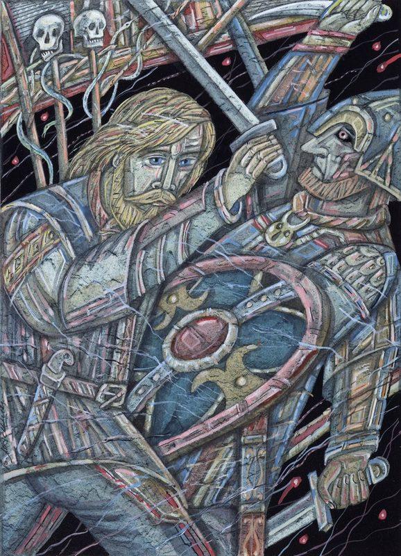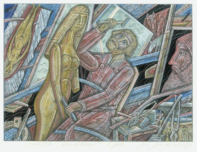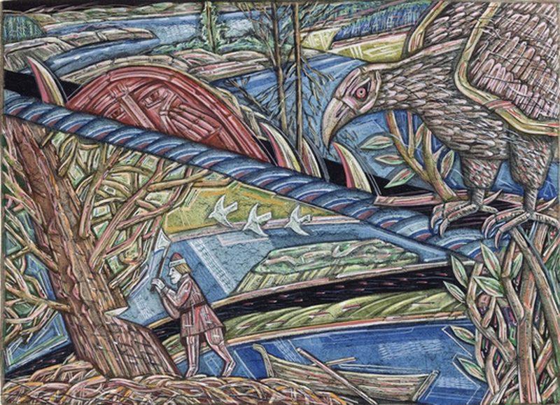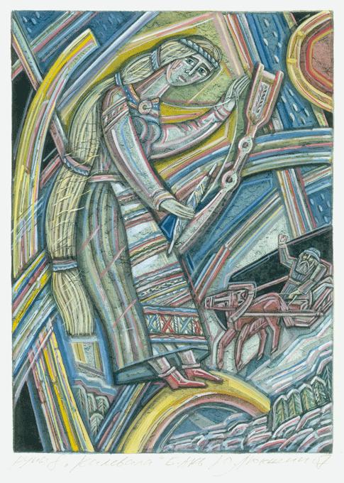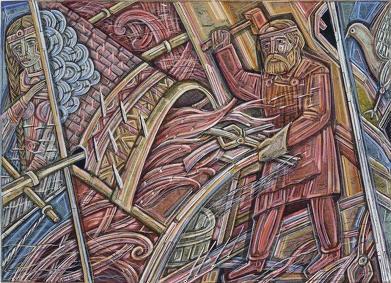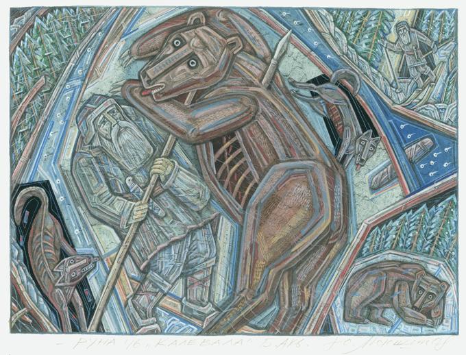 Итак, Вяйнямёйнен начал вытесывать лодку из осколка веретена сидящей на радуге красавицы. Но как ни умело он это делал, подвернувшийся черт подтолкнул топор, и он вонзился в ногу героя. И здесь начинаются долгие хлопоты по остановке кровотечения и излечению раны.