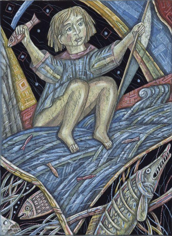 В пятой песни «Калевалы» рассказывается о том, как Вяйнямёйнен, узнав о гибели своей молодой невесты, долго горюет и страдает, пока не решает выловить утопленницу. Отправившись на промысел, Вяйнямёйнен действительно вылавливает очень странную на вид рыбину — не то лосося, не то семгу, не то девушку. Не поняв, с чем имеет дело, герой решает отведать кусочек рыбины. Но когда он достает нож, рыба вдруг вырывается из рук и только на безопасном от лодки расстоянии выныривает из воды и говорит, что она вовсе не рыба, а невеста Вяйнямёйнена и приходила к нему, чтобы стать вековечной супругой.
