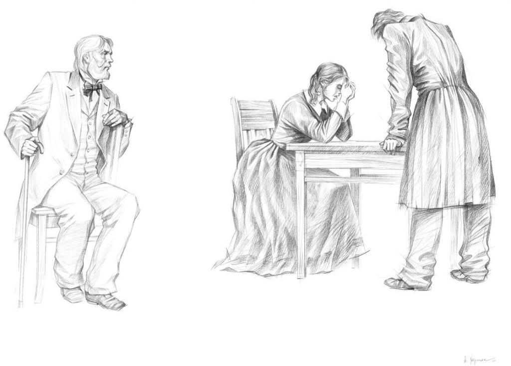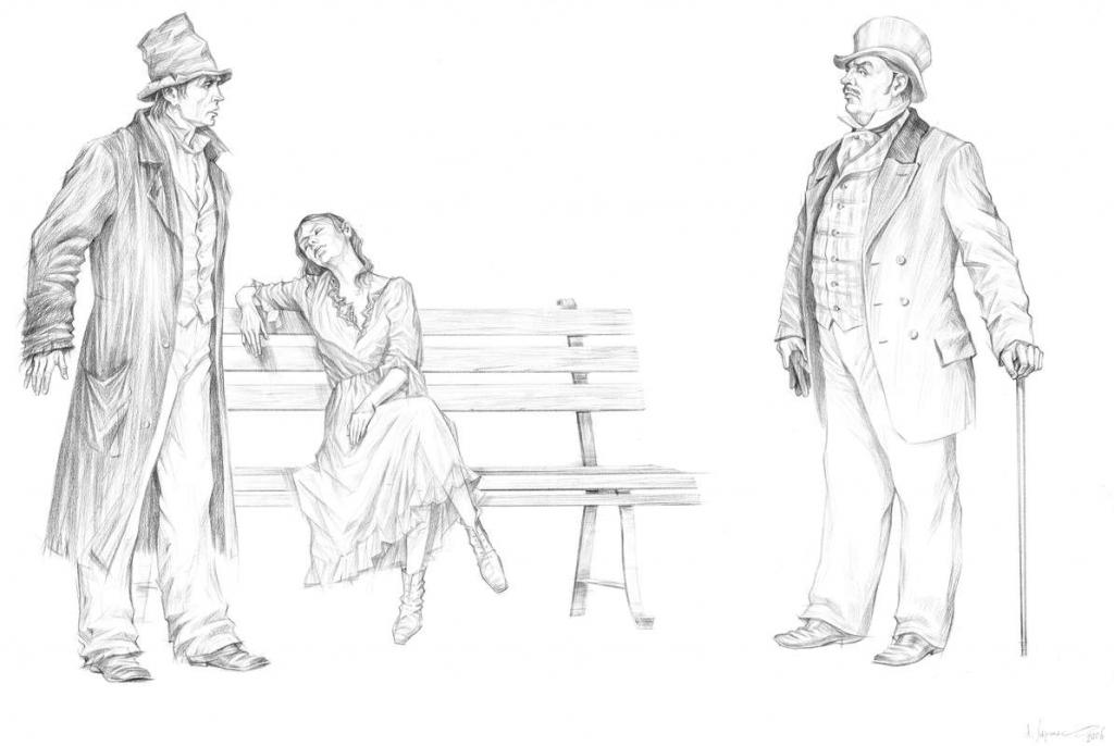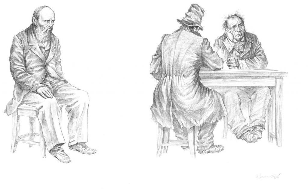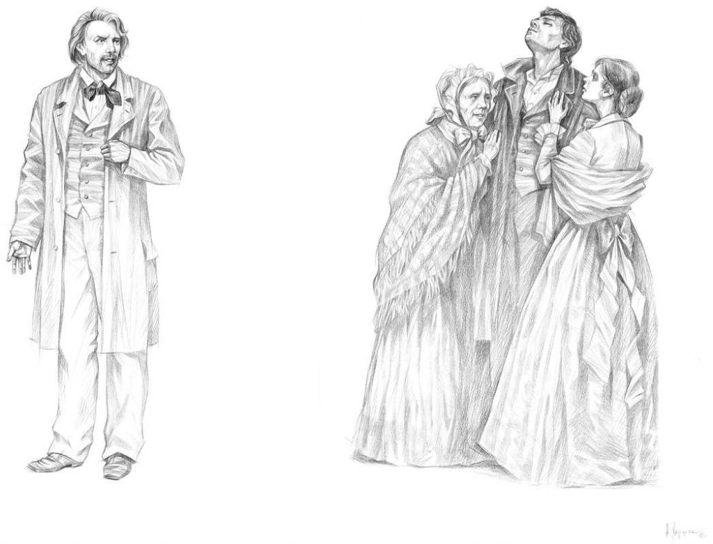 С литературой мне везло: «Алые паруса» и «Бегущая по волнам» А. С. Грина, «Аэлита» А. Н. Толстого, «Вересковый мед» Р. Л. Стивенсона и др. Все это были предложения издательства с хорошими полиграфическими параметрами и большим количеством иллюстраций. И только однажды мне удалось задумать, выполнить и добиться издания собственного замысла. Это была серия офортов к роману Михаила Булгакова «Мастер и Маргарита». И поддержку в осуществлении этой работы я встретил в петрозаводском издательстве «Карелия». Первое издание вышло к столетней годовщине писателя, а второе — четырьмя годами позднее. Потом в книжной графике для меня наступил перерыв, длившийся почти пятнадцать лет. К книге тянуло, но иллюстрировать что-то менее значимое, чем «Мастер и Маргарита», никак не хотелось, да и книгоиздание в стране в последнее десятилетие XX века оставляло желать лучшего. Появление на прилавках первых книг издательства «Вита Нова» заставило неровно задышать многих художников-графиков. Зачесались руки и у меня. Хотя сейчас я никак не могу вспомнить, что же все-таки послужило импульсом для начала работы над иллюстрациями к «Преступлению и наказанию» Ф. М. Достоевского. Скорее всего, это расположение нашей мастерской в переулке Бойцова, бывшем Малковом. Его не раз миновал Родион Раскольников, направляясь от Сенной площади к дому старухи процентщицы. Не все складывалось гладко, и мне не сразу удалось убедить руководство издательства в правильности выбранной визуальной концепции великого и мучительного романа. И я благодарен издателям за терпеливое внимание к моей работе. Первые композиции датированы 2004 годом. Значит сама идея возникла годом раньше. Около года я регулярно посещал Отдел эстампов Российской национальной библиотеки с одной лишь целью — погрузиться в атмосферу Санкт-Петербурга шестидесятых годов XIX столетия. Само общение с документальным материалом уже вызывало трепет, восхищение и огромное удовольствие. Одну за другой я перелистывал папки литографированных иллюстративных циклов А. И. Лебедева (1830–1898), Н. А. Зауервейда (1836–1866), М. С. Башилова (1821–1870), В. Ф. Тимма (1820–1895), П. М. Боклевского (1816–1897) и др. Именно эти авторы давали возможность зрительно и почти осязаемо ощутить многоплановость петербургского типажа различных социальных слоев. Вообще без такого всестороннего прощупывания времени и места действия, а также действующих персонажей мною не начиналась ни одна серьезная работа. Я не способен к импровизации и приступаю к первым эскизам только на основе конкретной иконографической информации. Вот пример тридцатилетней давности. «Алые паруса» А. С. Грина — книга, которую мне пришлось иллюстрировать в двадцатисемилетнем возрасте, и, должен признаться, что именно тогда я впервые прочитал текст. Но прочитал совсем по-другому, чем если бы это случилось десятью-двенадцатью годами ранее. Я не нашел там ничего сказочного, напротив, — все абсолютно реально. «Сказку надо творить своими руками». Так и поступал капитан Грэй. И несмотря на то, что А. С. Грин последние годы жил в Старом Крыму и истоки его вдохновения принято искать в южных широтах, я плотно засел в фондах Музея антропологии и этнографии и пересмотрел материалы по Швеции, Голландии, Финляндии и Дании. Было сделано большое количество зарисовок предметов материальной культуры, 