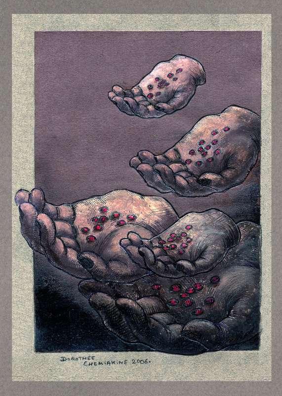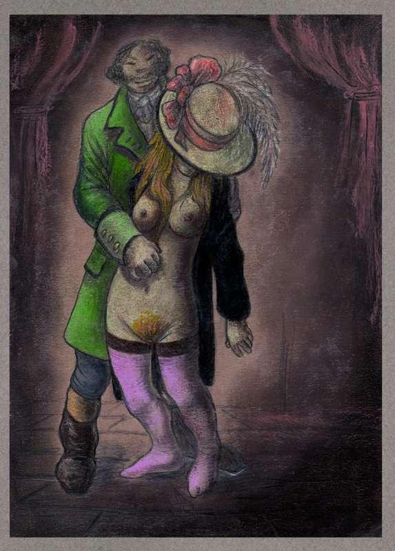 У Мамлеева много «физиологических», бытовых моментов, хорошо прописанных. Там я могла позволить себе ироническую интерпретацию, а в случае с Майринком — нет. У Майринка же совершенно нет чувства юмора. Поэтому я ощущала большую ответственность. Отец упрекает, что я время от времени ухожу в патологию. У меня действительно ярко выражен элемент органики: мясо, плоть с прожилками, всё объемное. Я очень люблю живую фактуру. Вот, например, китайская капуста — у нее листья такие живые, там каждая венка проступает. Я эту китайскую капусту даже есть не хочу, хотя она очень вкусная. Она меня интересует не как продукт питания, а как продукт красоты. Потому что это живое органическое кружево. Я старалась нащупать эту органическую ткань и у Майринка, когда иллюстрировала его. Труднее всего мне давались иллюстрации, где нужно было делать лицо. Вот, например, изобразить Голема было просто — я его примерно таким косоглазым и представляла. Трудно было найти образы Мириам, Ангелины, Ляпондера… Здесь я консультировалась с мамой, поскольку она великолепный портретист. Кстати, меня очень удивила внешность Густава Майринка. Я прочитала почти все его произведения, но портрет увидела только в прошлом году. До этого совсем не таким его представляла. Он внешне вполне симпатичный человек, но похож на какого-то пожилого почтальона. А я представляла утонченный тип вроде Оскара Уайльда или Кафки. Поначалу я не могла решить, в какой технике это делать — в цветной или в черно-белой. Всё-таки Майринк очень много уделяет внимание цвету. Например, существо, являющееся к главному герою с зернами, имеет вместо головы светящийся голубой шар… Я поняла, что без цвета обойтись невозможно. Я использовала смешанную технику: карандаш, масляная пастель, кое-где шариковая ручка, тушь, коллаж. Я не считаю себя такой persona grata, чтобы рассуждать о «Големе». Мое скромное дело было создать иллюстрации. Этим я выразила мое отношение к «Голему» и к его автору — великолепному Густаву Майринку.
